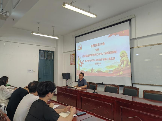 首先,深入学习习近平总书记重要文章《锲而不舍落实中央八项规定精神,以优良党风引领社风民风》牛振振强调全体党员同志落实中央八项规定精神的重要性,要求各位同志严守纪律红线,抵制歪风邪气,以优良作风引领学风清正。随后,在接收预备党员议程3名发展党员经陈述入党志愿、介绍个人思想情况、投票等环节,成为预备党员并表态,全体党员随后面向党旗宣誓。最后,张涵同志以《从八项规定入手抓党的作风建设》为题讲授党课,深入解读其内涵实质,回顾党中央落实成效,强调高校应推动中央八项规定精神在校园落地。