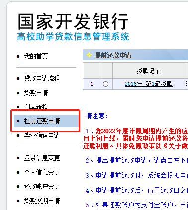 1.员工登录国家开发银行助学贷款信息网进行“提前还款”申请(11月除外)。每个月可以申请一次,1-15日申请的,计息到本月20日,本月20日为还款日;16-30日申请的,计息到下月20日,下月20日为还款日。