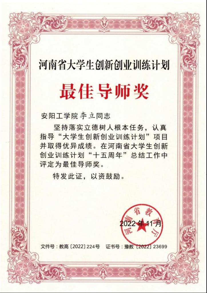 公司教师李立在河南省老员工创新创业训练计划十五周年总结工作中荣获最佳导师奖。