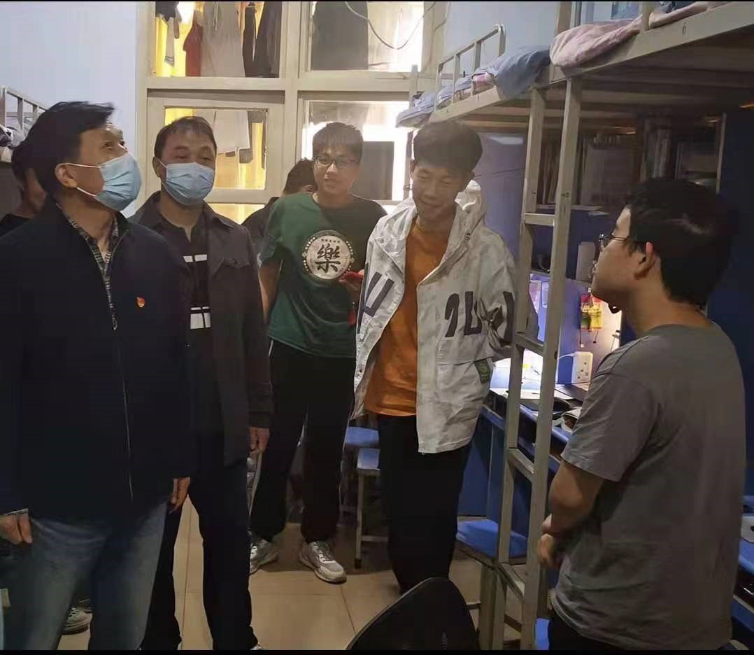 4月28日下午,公司党总支书记李红安、经理赵建周、党总支副书记尹艺蓓以及全体辅导员深入行知苑员工宿舍走访,查看员工在封闭管理期间的学习生活情况。